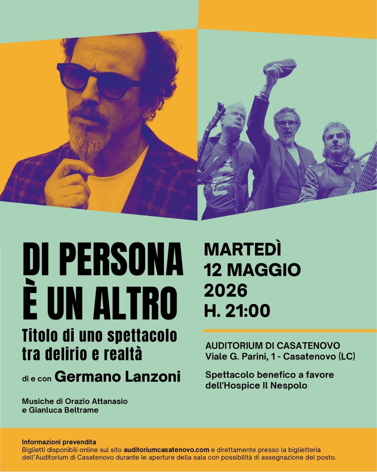 Il titolo dello spettacolo è «Di persona è un altro», un’opera scritta e interpretata da Germano Lanzoni, noto come il Milanese Imbruttito e speaker delle partite del Milan a San Siro. Lanzoni sarà accompagnato da Gianluca Beltrame e Orazio Attanasio, che lo supporteranno dal vivo con chitarra e voce. L’evento si svolgerà alle 21 di martedì 12 maggio 2026 presso l’auditorium di Casatenovo, con l’obiettivo di raccogliere fondi per la Fabio Sassi di Merate.